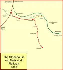 In 1862 it was proposed to build a branch railway from Stonehouse on the former Bristol and Gloucester Railway line to Nailsworth. The B&GR had now passed into the possession of the Midland Railway. Sufficient support seemed to be forthcoming, and a parliamentary bill went to the 1863 session of Parliament. With little opposition, the bill was passed as the Stonehouse and Nailsworth Railway Act 1863 (26 & 27 Vict. c. cxxxii) on 13 July 1863. Authorised capital was £66,000.[1][2][3]