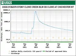 The United States Geological Survey (USGS) maintains stream gauges along Stony Clove Creek. The station in Chichester in operation since 1997, 1.8 miles (2.9 km) upstream from the Esopus, had a maximum discharge of 14,300 cubic feet (400 m3) per second on August 28, 2011, as Hurricane Irene passed through the area. It had a minimum discharge of 3.1 cubic feet (0.088 m3) per second on October 3, 2014.[4] A former station in operation from February 1997 to August 2007, 1.3 miles (2.1 km) upstream from the Esopus, had a maximum discharge of 13,000 cubic feet (370 m3) per second on April 2, 2005, and a minimum discharge of 3.7 cubic feet (0.10 m3) per second from September 20–22, 2002.[5]