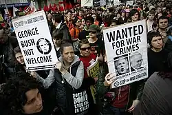 StWC also organised the protest against the 2007 Australian visit of former US Vice President Dick Cheney for his role in the Iraq War and occupation.[8] The protest took place on 22 February, during Cheney's three-day visit to discuss Australia's unpopular involvement in Iraq and general commitment to the "War on Terror".[12] Around 200 protesters were refused by police to march through the streets of Sydney, which was under high security for the Vice President's visit.[13]