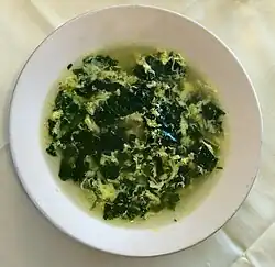 According to Ada Boni, stracciatella alla romana used also to be scented with marjoram.[2] Other traditional Italian and Italian-American recipes suggest garnishing with chopped parsley.[4][5] Some American variations of the soup incorporate spinach as a main ingredient.[6][7]