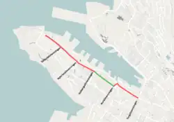 Strandgaten is a street in the city centre of Bergen, Norway, west of the bay of Vågen. It starts at Torgallmenningen and follows the eastern shore of the Nordnes peninsula to Tidemands gate, where it becomes Nordnesgaten. The easternmost quarter of Strandgaten is a regular two-way street, while it is an eastbound one-way street between Tollbodallmenningen and Holbergsallmenningen, and between Østre Murallmenningen and Torgallmenningen. Between Holbergsallmenningen and Østre Murallmenningen the street is pedestrianised. In total, Strandgaten is approximately 1.2 km long.