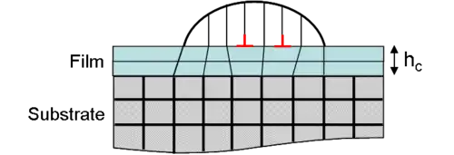 Since the formation of wetting layers occurs in a commensurate fashion at a crystal surface, there is often an associated misfit between the film and the substrate due to the different lattice parameters of each material. Attachment of the thinner film to the thicker substrate induces a misfit strain at the interface given by . Here and are the film and substrate lattice constants, respectively. As the wetting layer thickens, the associated strain energy increases rapidly. In order to relieve the strain, island formation can occur in either a dislocated or coherent fashion. In dislocated islands, strain relief arises by forming interfacial misfit dislocations. The reduction in strain energy accommodated by introducing a dislocation is generally greater than the concomitant cost of increased surface energy associated with creating the clusters. The thickness of the wetting layer at which island nucleation initiates, called the critical thickness , is strongly dependent on the lattice mismatch between the film and substrate, with a greater mismatch leading to smaller critical thicknesses.[9] Values of can range from submonlayer coverage to up to several monolayers thick.[1][10] Figure 2 illustrates a dislocated island during SK growth after reaching a critical layer height. A pure edge dislocation is shown at the island interface to illustrate the relieved structure of the cluster.