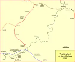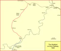 The Oxford, Worcester and Wolverhampton Railway (OW&WR) opened its main line throughout in 1854; it passed through Honeybourne, somewhat to the east of Evesham. The OW&WR had decided to construct a branch line to Stratford from Honeybourne, and it opened the line to the public on 12 July 1859. It was a narrow (standard) gauge line. The Stratford station was on the south side of the town, at Sancta Lane.[2][3][4]