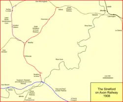 In 1908 the Stratford-upon-Avon and Midland Junction Railway was formed from amalgamation of the East and West Junction Railway, the Evesham, Redditch and Stratford-upon-Avon Junction Railway and the Stratford-upon-Avon, Towcester and Midland Junction Railway.[16] The Broom Junction to Stratford-upon-Avon passenger service was withdrawn on 16 June 1947,[17] followed by the passenger service east of Stratford on 7 April 1952.[18][9]