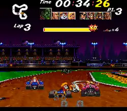 Street Racer is a racing video game published by Ubi Soft for various systems. It was released for the Super Nintendo Entertainment System in 1994,[5] Sega Mega Drive in 1995,[6] PlayStation,[7] Sega Saturn and Game Boy in 1996[8] and Windows[4] and Amiga in 1997.[9] Marketed as a "cross between Mario Kart and Street Fighter",[10] the go-kart themed game combined racing with comedy and beat 'em up influenced violence. The game was a success on the SNES and Mega Drive and received mixed reviews across platforms.