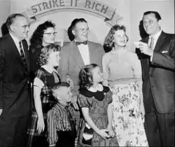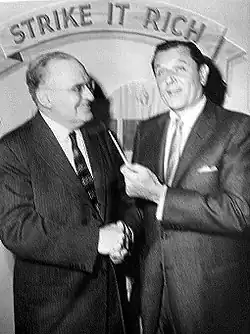 Strike It Rich is a game show that was broadcast on American radio from June 29, 1947, to December 27, 1957, on CBS and NBC.[1] It was broadcast on television as well, starting in 1951. Billed as “The quiz show with a heart”, people in need of money (such as for medical treatment or a destitute family) appeared and told their tale of woe, then tried to win money by answering four questions. If the contestant did not win any money, the emcee opened the "Heart Line", which was a phone line to viewers who wished to donate to the contestant's family.[2]
