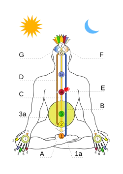 Subtle body concepts and practices can be identified as early as 2nd century BCE in Taoist texts found in the Mawangdui tombs.[1] It was "evidently present"[1] in Indian thought as early as the 4th to 1st century BCE when the Taittiriya Upanishad described the Panchakoshas, a series of five interpenetrating sheaths of the body.[2] A fully formed subtle body theory did not develop in India until the tantric movement that affected all its religions in the Middle Ages.[1] In Indo-Tibetan Buddhism, the correlation of the subtle body to the physical body is viewed differently according to school, lineage and scholar, but for completion stage in yoga, it is visualised within the body.[3] The subtle body consists of focal points, often called chakras, connected by channels, often called nadis, that convey subtle breath, often called prana. Through breathing and other exercises, a practitioner may direct the subtle breath to achieve supernormal powers, immortality, or liberation.