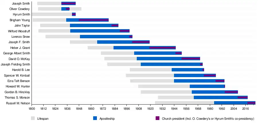 Prior to 1889, whether succession was to proceed by apostolic seniority had not become a universal expectation.[14] The History of apostolic succession within the LDS Church follows.[15][16][17]