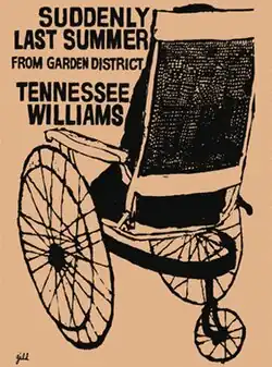 Suddenly Last Summer is a one-act play by Tennessee Williams, written in New York in 1957.[1] It opened off Broadway on January 7, 1958, as part of a double bill with another of Williams' one-acts, Something Unspoken (written in London in 1951).[2]: 52 The presentation of the two plays was given the overall title Garden District, but Suddenly Last Summer is now more often performed alone.[3] Williams said he thought the play "perhaps the most poetic" he had written,[2]: 86 and Harold Bloom ranks it among the best examples of the playwright's lyricism.[4]