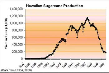 Sugarcane was introduced to Hawaiʻi by its first inhabitants in approximately 600 AD and was observed by Captain Cook upon arrival in the islands in 1778.[1] Sugar quickly turned into a big business and generated rapid population growth in the islands with 337,000 people immigrating over the span of a century.[2] The sugar grown and processed in Hawaiʻi was shipped primarily to the United States and, in smaller quantities, globally. Sugarcane and pineapple plantations were the largest employers in Hawaiʻi.[3] Sugar production ended in 2016, with a small quantity of sugarcane still being grown for the manufacture of Rhum agricole.