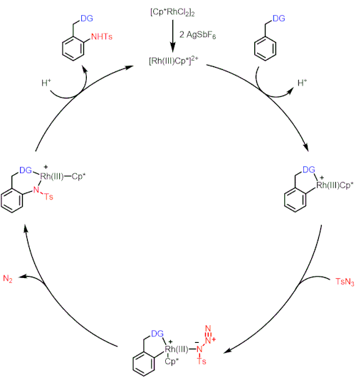 Rhodium or iridium catalyzed C-H amidation and amination are other achievements of his group. In 2012, his group published rhodium catalyzed intermolecular amidation of arenes using sulfonyl azide as a nitrene precursor.[12] This reaction generates N2 as the single byproduct, doesn't need external oxidant, has broad substrate scope and high functional group tolerance. Chang's group advanced their work by using different directing groups,[13] different azides[14] and various substrates.[15] They also published that iridium also works well for C-H amidation/amination.[16][17][18]