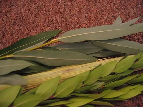 The third chapter of tractate sukkah is titled "The Stolen Lulav", after the words that begin the Mishna to the third chapter. The chapter deals with the laws pertaining to the verse in Leviticus 23:40 which states that on the holiday one must take "the fruit of a beautiful tree, branches of a date palm, boughs of a dense-leaved tree, and willows of the brook". The Talmud seeks to determine the identity of these species to fulfill the commandment of the Torah. In addition, it discusses further laws regarding the obligation to take the species, including the number of species to take and the manner in which to take it. Branches of the date is understood to refer to the lulav, a dense leaved tree to the myrtle, and "willows of the brook" refers to the willow. The fruit of the beautiful tree is the etrog. On page 30, the Talmud discusses why a stolen lulav is unfit and explains that it is because it was acquired through transgression. As Rabbi Johanan explains the verse in Isaiah 61:8 states that the Lord hates robbery.[8] On page 32 the story is told of an old lady who approached Rav Nachman with distress, saying that the Reish Galuta (Exilarch) and his Boyz were sitting in a stolen sukkah. She said the sukkah was stolen, but he said the sukkah was valid but she has rights to the monetary value of the wood.[9] On page 32, the Talmud continues the discussion of a lulav that was taken from the grounds of an idol worshipping city. Pursuant to the discussion, the Talmud notes that there is a dispute regarding whether a lulav, or palm branch, taken from the gates of hell, that is the valley of Hinnom by Jerusalem (Gei-Hinnom), may be used to fulfill the obligation. On 32b the Talmud proceeds with an identification of the dense-leaved tree as being synonymous with the myrtle branch. It rejects identification of this tree with an olive tree, an oriental plane tree, and oleander.[10]