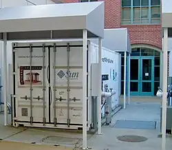 Sun Modular Datacenter (Sun MD, known in the prototype phase as Project Blackbox) is a portable data center built into a standard 20-foot intermodal container (shipping container), manufactured and marketed by Sun Microsystems (acquired in 2010 by Oracle Corporation). A data center of up to 280 servers could be rapidly deployed using existing standardized transport methods to locations that might not be suitable for a building or other structure, and connecting it to the required infrastructure (including an external chiller and power source).[1] Sun stated that the system could be made operational for 1% of the cost of building a traditional data center.[2]
