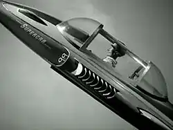 There were several working models of Supercar, which was designed by art director Reg Hill.[13] The larger "hero" model was about seven feet (2.1 m) long and cost £1,000 to build.[1] Made of lightweight wood and Perspex, it was constructed by Laurie Barr of Aeronautical and General Modelmakers (now Mastermodels). A mid-sized model, around one metre (3 ft 3 in) long and sculpted by Slough craftsman Bill James, as well as a smaller model, about 0.5 metres (1 ft 8 in), were used for the titles. One of the smaller models, used in distance shots, was about nine inches (23 cm) in length and was also sculpted by Bill James. John Peel likens Supercar's appearance to that of the 1959 Cadillac Fleetwood Sixty.[10]