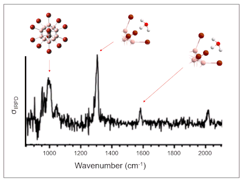 Figure 9: IRPD spectrum of the reaction product of [B12X11] and methane. Animated are the vibrational motions of the strongly IR active modes including the characteristic inversion vibration of the coordinated hydronium ion. (For moving animation of the figure, please click on it).