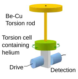 The film's superfluid response can be measured by using a torsional oscillator to measure the moment of inertia of a cell containing it. The oscillator comprises a torsion rod to which the cell is attached, together with an arrangement for oscillating the cell at its resonant frequency around the rod's axis. A higher resonant frequency corresponds to a lower moment of inertia.