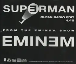 "Superman" is a song by American rapper Eminem from his fourth studio album, The Eminem Show (2002), featuring guest vocals from his frequent collaborator, singer Dina Rae. Written by Eminem, Jeff Bass and Steve King, the song was released as the third single from The Eminem Show on January 21, 2003, in the United States only. It peaked at number 15 on the Billboard Hot 100 chart on the issue dated March 15, 2003, and received 2× Platinum certification by the Recording Industry Association of America (RIAA).
