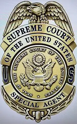 The Supreme Court of the United States Police Department (SCUSPD),[1] commonly referred to as the Supreme Court Police, is a United States federal security police agency responsible for security and law enforcement services concerning the properties, personnel, and visitors of the Supreme Court of the United States. The SCUSPD enforces federal and District of Columbia laws and regulations, as well as enforces regulations governing the Supreme Court Building and grounds as prescribed by the head of the SCUSPD (the Marshal of the United States Supreme Court) and as approved by the Chief Justice of the United States. In addition to more common law enforcement tasks, SCUSPD personnel, in conjunction with United States Marshals Service personnel, are responsible for providing personal protection details to Supreme Court justices (and the chief justice) both domestically and internationally, as well as the justices' homes. Sworn SCUSPD personnel may exercise law enforcement powers and carry firearms throughout the District of Columbia, and nationally when protecting SCOTUS justices or property; such authority is derived from 40 U.S.C. § 6121.
