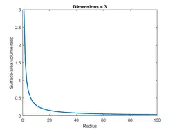 So the ratio equals . Thus, the same linear relationship between area and volume holds for any number of dimensions (see figure): doubling the radius always halves the ratio.
