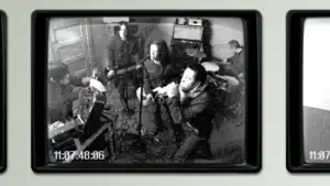 Still image from the black and white video with the band.