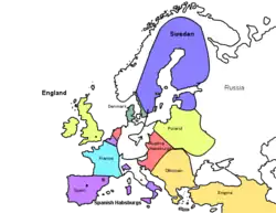 Bogislaw XIV, Duke of Pomerania, pledged his assistance as well, but he was desperately isolated. The Margraviate of Baden as well as William of Hesse also pledged their support.[37] However, even once the Swedes were in Germany they expressed a great deal of reluctance and had to be constantly cajoled and browbeaten into contributing their resources to the cause. The only ardent supporters of the Protestant cause were the dukes of Hesse-Kassel and Brunswick-Lüneburg. These evangelical princes held themselves in complete readiness to join hands with the Swedish. Although little favored the Protestant cause at the time, there was unrest in the entirety of Germany as a result of the horrible atrocities that the catholic armies incurred, on Catholic and Protestant states alike.[40] Everyone alike in Germany, as well as elsewhere in Europe – France, always fearful of the Habsburgs – feared Ferdinand II and the increasing resources that he could bring to bear. France was in favor of Swedish intervention, but because France was also Catholic, and Cardinal Richelieu, France's de facto prime minister, did not desire to openly declare against Catholicism, only offered monetary contributions. However, France refused Gustavus' demands for contributions. He demanded a lump sum upfront, and 600,000 Rixdollars[b](or 400,000 talers[34]) per year subsequently.