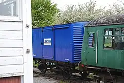 LMS PBA27 4-wheel ventilated van Unknown build date. Later used by the Port of Bristol Authority and numbered 27. Recently restored to operational condition and painted blue with a 'Jewson' logo.[13]