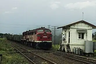 A southbound goods train in 1987 near Kyogle, where until 1930 the track terminated. Previously, both passengers and freight on the (further inland) Main North line had to change between standard gauge (NSW) and narrow gauge (QLD) Staff operation, in which tokens authorizing access to track sections are physically exchanged, has now been superseded by Centralised traffic control in the corridor