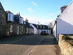 Hugh Glover held the lands of Townend circa 1701-4 and in 1733 William Kelso of Dankeith sold the lands to George Boyd of East Overloan Farm. William Hay Boyd, Esq. of Her Majesty's 20th Regiment of Infantry in the Crimea[29] and was the owner of Townend House (NS 37652 31552) and estate in 1839.[24] Townend is an 18th-century building with a Victorian Italianate wing. A dated lintel in the walled garden may have come from an earlier building on the site; the old stables, were converted into a small dwelling in the 1960s.[30] In recent times Townend Cottage has functioned as a nursing home,[16] Townend Cottage, circa 1810, situated in the village was its former dower house. The Hay-Boyds gave land for the village hall, a school, and a garden next to the church.[29]