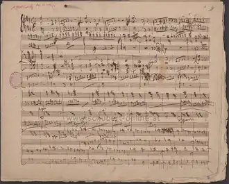 The fast and light third movement is the most complete of all the movements in this sketch. It is a scherzo and trio written in the tonic key.[1][3] The motive in eighth notes in its first bar was later reused in the scherzo of Schubert's ninth symphony.[3] The opening is a lively fugato based on this motive, before the main melodies enter.[3] The initial motive forms the basis for the accompaniment.[3] The second section of the scherzo focuses around the mediant key of F♯ minor before returning to the opening material. The trio is set in the subdominant key of G major; though incomplete, only a few bars have to be reconstructed for the movement to be performable.[4] Again, the trio sends the clarinet into the extreme high register (up to sounding D6).[1]
