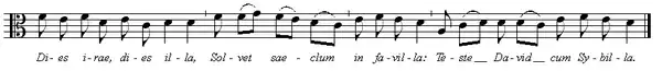As commentators have pointed out,[7] the first four notes of which match the Dies Irae chant, part of the Latin mass for the dead: