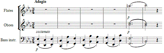 Yet another quotation of the introduction appears in the coda section. Wigmore writes, "Near the end of the movement, a series of seismic orchestral shocks heralds another dramatic pause and a return of the lugubrious introduction, complete with drumroll, in its original Adagio tempo."[11] The formal procedure of quoting the slow introduction in the coda section had been previously employed by Mozart in his String Quintet K. 593 (1790). When the latter work was new, Haydn learned about it by playing it, along with Mozart and other friends, at a social gathering in Vienna in December 1790.[12] The same procedure was soon to be adopted by Haydn's former pupil Beethoven, who quoted the slow introduction in the coda of the opening movement of his "Pathétique" piano sonata, published four years after the "Drumroll" Symphony in 1799.
