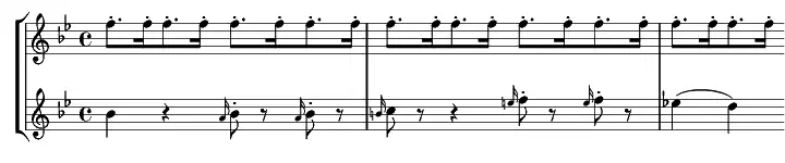 The second theme in B♭ major features dotted repeated notes in a solo oboe against jerky acciaccaturas in the first violins. This is the "Hen" motif that gives the symphony its nickname, although it is also related to the dotted rhythm response in the first theme.[3] The development features the exploration of the two themes in different keys. It opens with the first theme in C minor, followed by the second theme in E♭ major and F minor. The first theme is then heard contrapuntally leading towards the dominant allowing for a retransition to the tonic for the recapitulation. The first theme is recapitulated in G minor while the second theme is recapitulated in G major.[3]