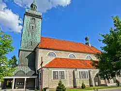 The street is an old communication route connecting Bydgoszcz with settlements located in south Kujavia. The road used a ravine in the slope of the Bydgoszcz urstromtal, stretching towards the forest. Along the axis was built in the 13th century Saint Giles church, near the Brda river, probably funded by Casimir I of Kuyavia.[24] In the 17th and 18th centuries, the route connected the town with southern villages such as Rupienica or Glinki. Further on, past the forest, it led to Przyłęki and towards Jezioro Jezuickie (English: Jesuit Lake).[25] In 1920, as Bydgoszcz territory expanded, a dozen of surrounding suburban communes were included in the city borders (including Szwederowo, Bielice and Rupienica): as a consequence, Kujawska street has been running since that year entirely within the municipal administrative boundaries.[26] In the 1980s, the street was thoroughly modernized, widened up to two carriageways with 3 lanes and the large Kujawski roundabout built, with underground passages which were never used,[27] then razed in 2019.[28] The southern segment of Kujawska street was renamed in 2005, Aleja Jana Pawła II in honor of John Paul II.
