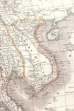 In 1778, Nguyễn Nhạc proclaimed himself "Heavenly King" (thiên vương) in a ceremony held in the citadel of the former Cham capital, Chà Bàn (Vijaya), near Qui Nhơn, taking the regnal name Thái Đức and choose the citadel of Chà Bàn as his capital.[99] The Trịnh recognized Nhạc the next year but accorded him only the rank of "Grand Duke" of Quảng Nam.[100] Through his adoption of a new regnal title, Nhạc was declaring the establishment of an independent southern state, rather than challenging the Lê emperor's claims to authority over all of Đại Việt. When detailing his plans for further territorial conquests to the British envoy Charles Chapman in the same year, Nhạc spoke only of conquering the former Nguyễn territories at that time under Trịnh control, making no mention of challenging Lê authority north of the Gianh River.[101]