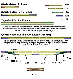 The use of Kato track created an early "informal" standard for the length of track on a module to be 310mm (which is 12.2"). A module of this size is typically referred to as a "single". A module with 620mm of track is referred to as a "double". Those with 930mm of track (3 x 310mm) are known as "triples" and, there are "quads" (4 x 310mm) and even longer T-TRAK modules for special situations. It is advisable that all track on straight modules be built as a multiple of 310mm units of track for reasons of compatibility. The reason this is advised is because most T-TRAK layouts consist of a double row of modules on a table and a non-standard length module on one side will not permit the loop to be closed. In order for a non-standard length module to be used, another module of equal length must be built and used on the other side of the table, or the layout must be constructed as a single row of modules with return loops on each end. While a non-standard length T-TRAK module can be constructed, the builder should recognize that doing so may limit the usability of that module in a multi-person, multi-club layout.