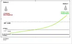 This first representation demonstrates where the slow reselect threshold (SRT), the fast reselect threshold (FRT), and propagation delay exceed parameters are most likely to be. These are represented in association with the decaying radio carrier as the distance increases from the TETRA base station.