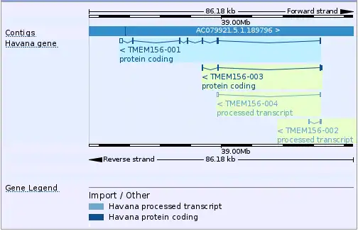 This image depicts the various transcript variants of TMEM156. It can be observed here that there are two variants that have protein coding function and two that are just processed transcripts.