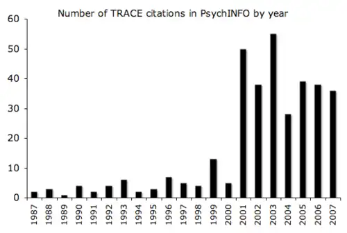 "TRACE was the first model that instantiated the activation of multiple word candidates that match any part of the speech input."[4] A simulation of speech perception involves presenting the TRACE computer program with mock speech input, running the program, and generating a result. A successful simulation indicates that the result is found to be meaningfully similar to how people process speech.