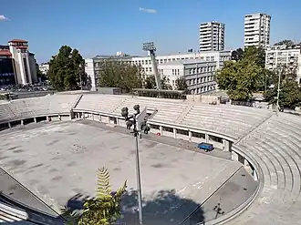 When opened, the stadium wasn't fully finished, but already in 1954 it hosted volleyball, basketball, and tennis matches.[4] Some of the best known happenings in the venue include: EuroBasket Women 1954, first Miss Yugoslavia contest in 1957 (won by Tonka Katunarić), 1957 World Women's Handball Championship (the inaugural world women championship), concerts of Alexandrov Ensemble in 1958 and later in the 1960s and 1970s of Mazowsze, Elton John, Ray Charles and Tina Turner and ice hockey matches with over 10,000 spectators.[8] Yugoslav national tennis team played the Davis Cup matches in 1956 in Tašmajdan and the curiosities held in the facility include the chess with live figures, the football matches played by the Zastava 750 cars[9] and the first Spanish corrida in Europe outside of Spain, when Luis Miguel Dominguín performed in September 1971.[4][7] Tašmajdan hosted the first FINA World Aquatics Championships in 1973.