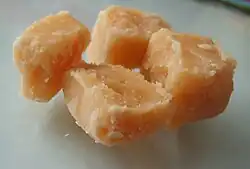 Tablet (taiblet in Scots[1][2][3]) is a medium-hard, sugary confection from Scotland. Tablet is usually made from sugar, condensed milk, and butter, which is boiled to a soft-ball stage and allowed to crystallise. It is often flavoured with vanilla and sometimes has nut pieces in it.[2][4]