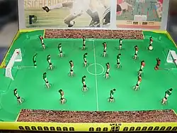 - ^ a b "Pilkarzyki" [Football]. Bufet PRL (in Polish). April 2017. Archived from the original on 27 December 2017. Retrieved 26 December 2017. Provides examples of several Polish-made implementation of the fixed-figures-on-springs type of game (a plastic one, named Football, from the company Przetwórstwo Tworzyw Sztucznych i Zabawkarstwo, and a metal one, Piłka Nożna ('Football'), from Zakłady Przemysłu Maszynowego Leśnictwa Krakpol in Krakow. Also illustrates a German game, Fussball Spiel ('Football Game') by VEB Plastverarbeitung Hedersleben, with movable pieces with actual kicking feet; it uses a ball that is not a sphere but a cuboctahedron, to limit rolling distance and bring it to a firm stop even if the table is not perfectly level.