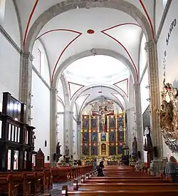 The church and former monastery of San Gabriel is located next to the Tacuba Metro station. The main entrance to the atrium has a stone gate with three arches. The small atrium is mostly paved with a few trees. The façade is mostly Baroque with the portal marked the two grooved Doric columns and topped by a frieze with vegetative design done in relief. It has one bell tower with two levels also in Baroque. The side portal faces Calzada Mexico-Tacuba. It also has an arched entryway, but marked with wavy grooved pilasters and topped with a niche. Part of the former cloister is also preserved. The interior is focused on the main altar, which is gilded and has twelve colonial era paintings of the Virgin Mary and various saints along with Salomonic columns. In the center is an image of the crucified Christ and the top has an image of God, the Father. One other feature of the church is an image of the Child Jesus called the “Niño futbolista” (Football playing child), named such because it is dressed in the uniform of Mexico’s national team when it plays in the World Cup .[4]