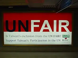 41. ^ "Multipronged campaign in 2018 highlights the aspiration of Taiwan's 23 million people to participate in the UN system". Ministry of Foreign Affairs, Republic of China (Taiwan) (Press release). 2 October 2018. Retrieved 10 January 2024.