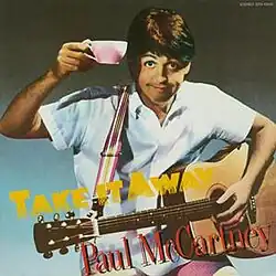 "Take It Away" is a single by the English musician Paul McCartney from his third solo studio album Tug of War (1982). The single spent sixteen weeks on the Billboard Hot 100 singles chart, reaching #10 and spending five consecutive weeks at that position.[2][3] It reached #15 in the UK.[4] The music video, directed by John Mackenzie, features former Beatles drummer Ringo Starr, long-time producer George Martin, and songwriting collaborator Eric Stewart, all of whom played on the track, as well as actor John Hurt, Linda McCartney and Barbara Bach.[5]