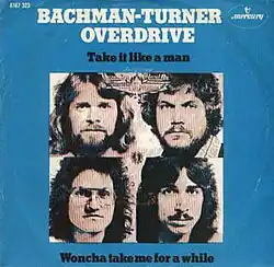 "Take It Like a Man" is a 1975 song written by Fred Turner and Blair Thornton, and first recorded by Canadian rock group Bachman–Turner Overdrive (BTO) for their December, 1975 album Head On. The lead vocal is provided by Turner. Released in January 1976, it was the first and more successful of two singles issued from the LP, the second being the jazzy "Lookin' Out for #1", which missed the U.S. Top 40 but gained some airplay on soft rock stations. "Take It Like a Man" was the sixth and last single by BTO to reach the Top 40 on the U.S. Billboard Hot 100, peaking at No. 33 on March 13, 1976.[2] On the Canadian RPM charts, it reached the No. 24 position.
