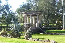 In 1931 Tanilba House was owned by Henry Halloran who designed such structures as "The Temple",[14] which is behind Tanilba House and which is visible on the main road leading to the house, the stone circular driveway, a wishing chair and other decorative stone structures on the property plus the elaborate gates at what were then the north and south entrances to the town. The stone for these structures was quarried locally from Mallabula. The northern gates are known as the water gates as they were designed to welcome visitors approaching from the water. Due to expansion the gates now stand inside the what were originally the suburb limits.