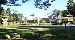 The centerpiece of this small town is Tanilba House, on Caswell Crescent, which is listed on the New South Wales State Heritage Register along with The Temple of the Stork nearby. It is one of Australia's oldest buildings[11] and the oldest in Port Stephens. In 1831 Lieut William Caswell, Royal Navy, received a land grant of 20.2 hectares (50 acres), along with an assignment of convicts who cleared the land and built Tanilba House from locally quarried quartz porphry stone and lime mortar made on the property from oyster shells. A small gaol was also built on the southern side of the house.[12] ten acres (4.0 hectares) on the eastern side of the hill was used as a vineyard soon after the house was built. An olive tree planted in the vineyard survives to this day and is heritage listed. A bunya pine, the wisteria covered pergola and two Port Jackson figs are also specifically listed.