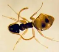 The ghost ant is small, with average lengths ranging between 1.3 to 2.0 millimetres (0.051 to 0.079 in) in workers.[2] The antennae composes of 12 segments that thickens towards the tip.[3] The antennal scapes exceeds the occipital border. The head and thorax is a dark brown colour while the gaster, legs and antennae are a milky white colour.[3][2] Due to its small size and light colour, the ghost ant is difficult to see.[4] Ghost ants are monomorphic and the thorax is spineless.[3] The gaster is hairless, and has a back opening that is similar to a slit-like opening.[4] The abdominal pedicel is formed from a single segment that is usually unable to be seen due to the gaster, and the species do not contain a stinger.[3] During development, this species undergoes three larval instars, which are all naked and fusiform, with reduced mouthparts.[5]