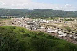 The town uses the Peace River which flows eastward as a source of drinking water and as outlet for industrial waste. The drinking water supply comes from an intake pipe southwest of town. The water is mechanically and chemically filtered then pumped to a reservoir on a ridge north of town. A gravity pump moves the water to the town from the reservoir using 18 km of watermains.[13] Sewage is collected by 13 km of sanitary sewers and processed by a two-cell lagoon system before being absorbed into the ground.[13]