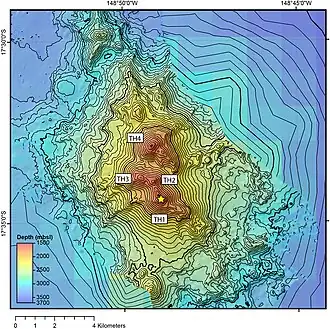 The seamount has four prominent cones.[1] Submersible dives in 1986 and 1989 found two active hydrothermal fields on the volcano's flanks.[3] A further dive in 2013 found ongoing hydrothermal venting.[1]